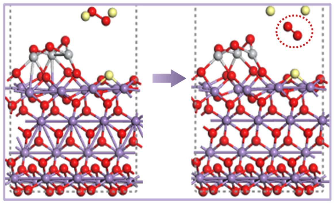 团队以富含OVs的α-MnO2为基础合成TiO2@α-MnO2二元催化剂,提出TiO2@α-MnO2二元催化剂活化H2O2的新路径。采用DFT理论计算分析表明,多元金属位点与H2O2相互激发,加快电子转移,能够克服电子跨越所需总量子能垒(0.68 eV),生成1O2等活性氧化物种,为控制水中新污染物奠定先进的纳米理论支撑。