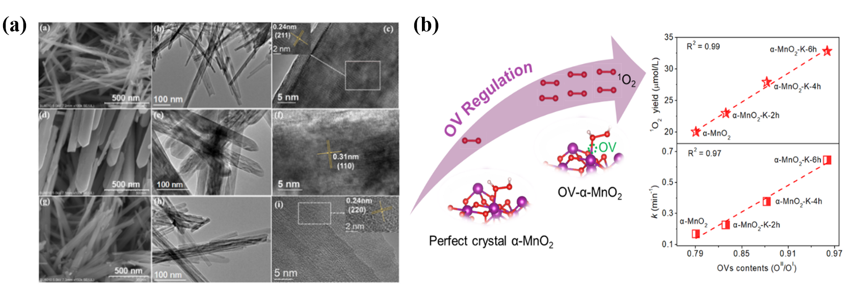 mk手机注册深圳国际研究生院张锡辉教授团队在多年纳米催化剂和催化陶瓷膜研发的基础上,开展锰铁钛系等多种类高效催化剂的合成。团队首先利用简易的一步水热法调控合成不同氧空位丰度的α-MnO2纳米纤维材料,实现H2O2定向活化生成1O2。结果表明,氧空位丰度、1O2产率和土霉素降解速率具有强相关性(R2>0.97)。富含氧空位的α-MnO2对H2O2的吸附具有最低的能垒,有利于1O2的定向生成。