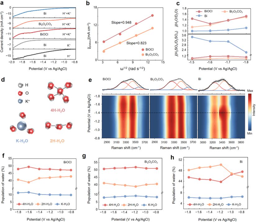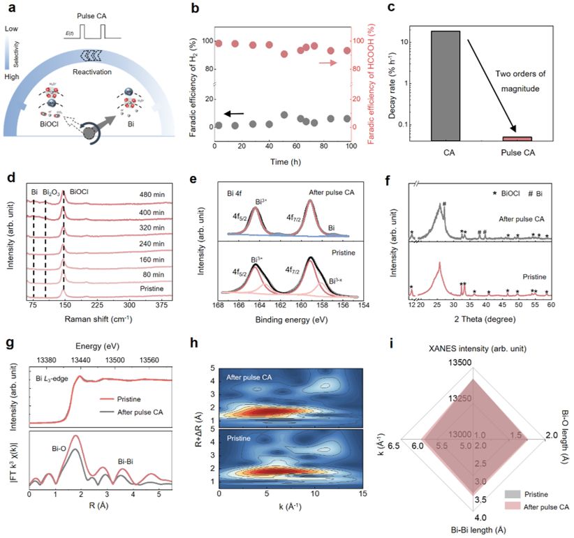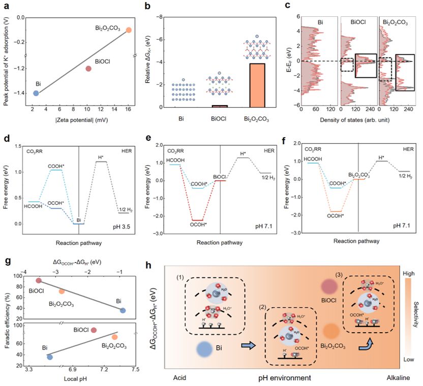 研究中,团队揭示了酸性CO2RR稳定性与催化剂表面重构的关系(图1)。结果表明,甲酸产物的法拉第效率随着氯氧化铋(BiOCl)催化剂物相的演变重构而下降。研究通过引入原位荧光成像技术,揭示了催化剂重构过程中表面局部pH的变化机制(图2),利用旋转圆盘电极、同位素效应和原位拉曼技术等手段表征分析了催化剂的界面水结构,提出局部pH的变化是由于质子与钾离子的竞争关系所导致(图3)。基于此,团队测试了催化剂表面的荷电性质,并通过理论计算证明酸性CO2RR中微环境变化与催化剂表面对CO2RR中间体本征吸附能力以及局部pH变化相关(图4),基于Bi与BiOCl在含氯电解液中存在可逆反应的原理,提出了脉冲电势的策略用以提高催化剂在酸性CO2RR的稳定性(图5)。该研究深入理解了酸性CO2RR中催化剂表面微环境的影响机制,并为设计酸性电解质中的稳定催化剂提供了指导。