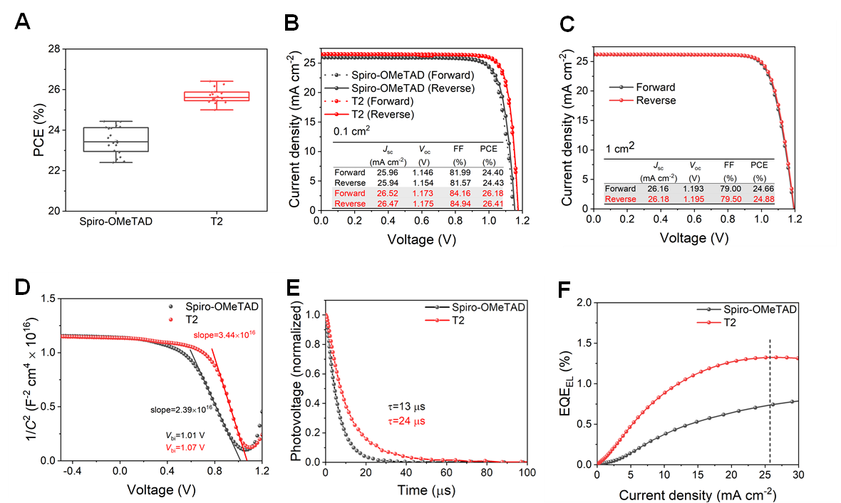 图4.基于spiro-OMeTAD和T2制备的钙钛矿太阳能电池的测试结果