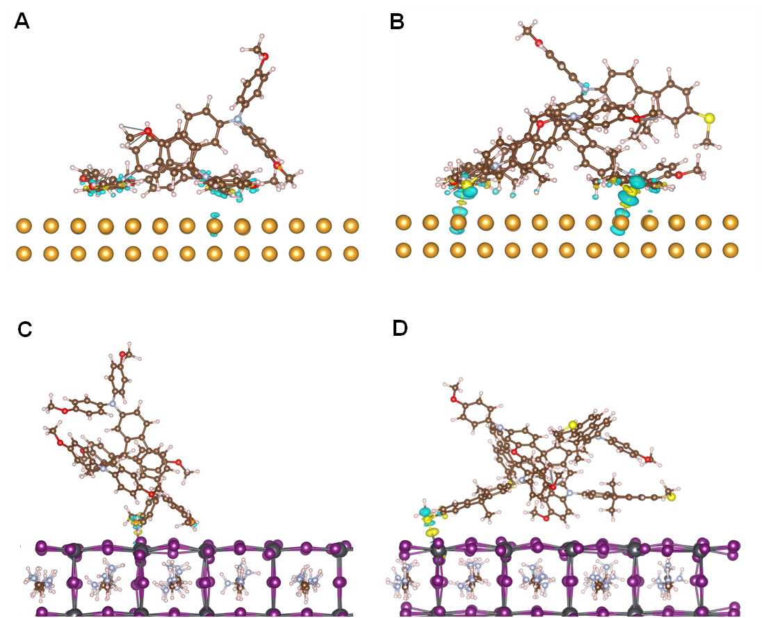 图2.密度泛函理论(DFT)计算Spiro-OMeTAD(左排)和T2(右排)分别跟金(上排)和钙钛矿(下排)吸附的差分电荷密度