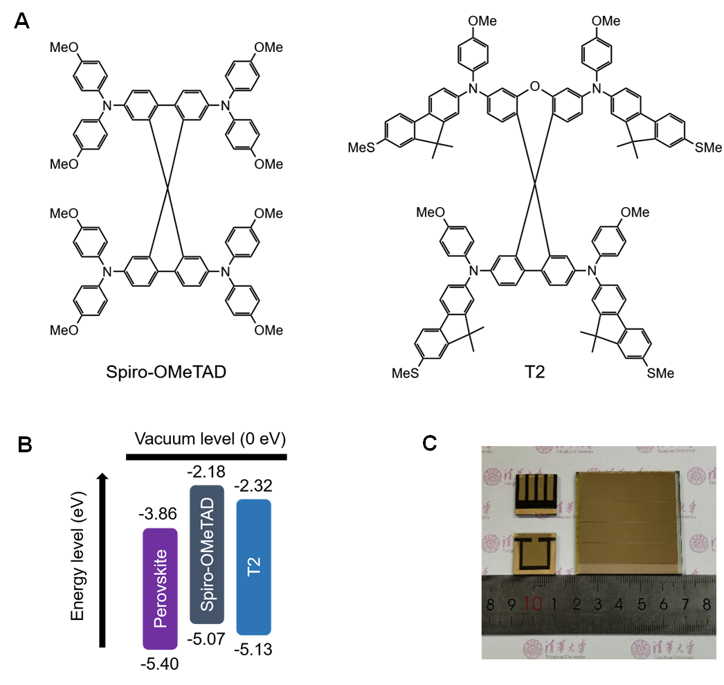 图3.Spiro-OMeTAD和T2的化学结构及能级位置和基于T2制备的钙钛矿电池和组件照片