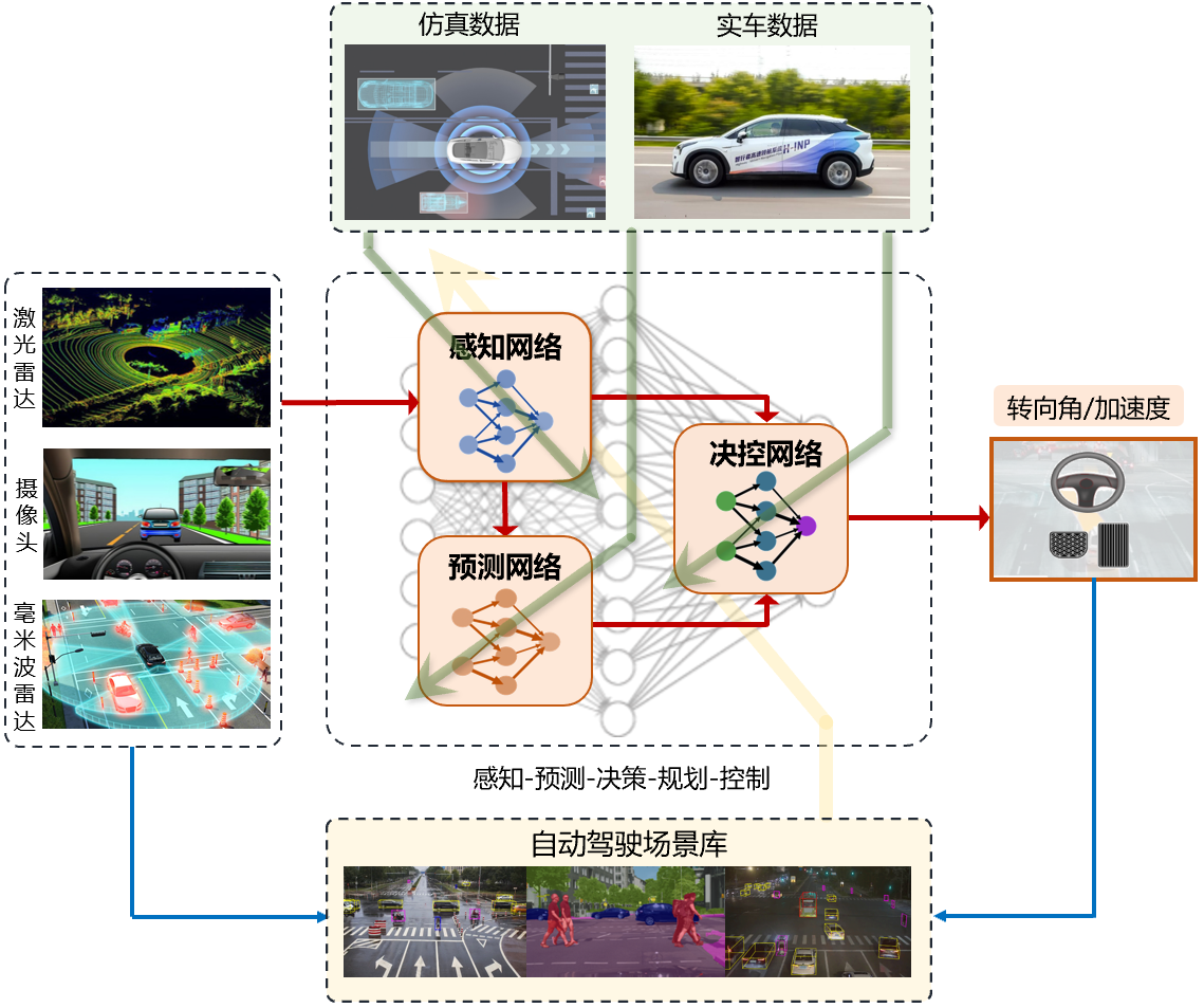 这一研究工作同时得到智行者、昇启科技两家高科技企业的全力支持,形成了校企之间紧密配合、通力协作的联合攻关团队。智行者团队主要工作在于环境感知模型的构建与预训练,昇启科技团队主要工作在于自动驾驶仿真平台的开发,三家单位共同完成了系统功能集成、性能评估迭代等后期任务。该研究获得国家“十四五”重点研发计划、国家自然科学基金以及mk手机注册自主科研计划支持。