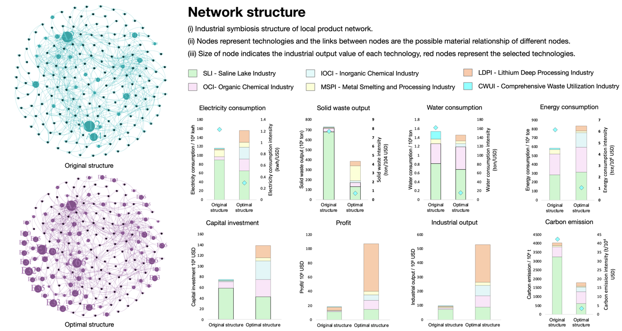 研究团队提出了一个自下而上的集成了物质流分析、超结构网络构建、优化集成和系统评价分析等工业生态学的多种方法的基于资源的区域工业经济发展优化模型(RRIEDOM),指导区域经济绿色发展和低碳转型。该模型建立了一个综合技术数据库,包括358项化工技术和200多种化工产品。论文选择青海湖化工产业区作为案例研究,研究评估了青海盐湖工业的现状,优化确定了经济产出最大化的同时资源和环境成本最小化的最优产业结构,进一步研究了从现有产业框架过渡到最优结构的最有效路径,设计了六种情景,通过纳入负碳技术,如清洁电力碳捕获、利用和储存(CCUS)以及蒸汽锅炉改造等措施来探究产业结构的脱碳路径。情景分析表明,不同转型路径的碳减排、经济产出和资源效率的效益存在差异,优化发展路径的碳减排、经济产出和资源效率的效益明显优于传统路径,表明区域产业采用清洁技术和产业共生的必要性。