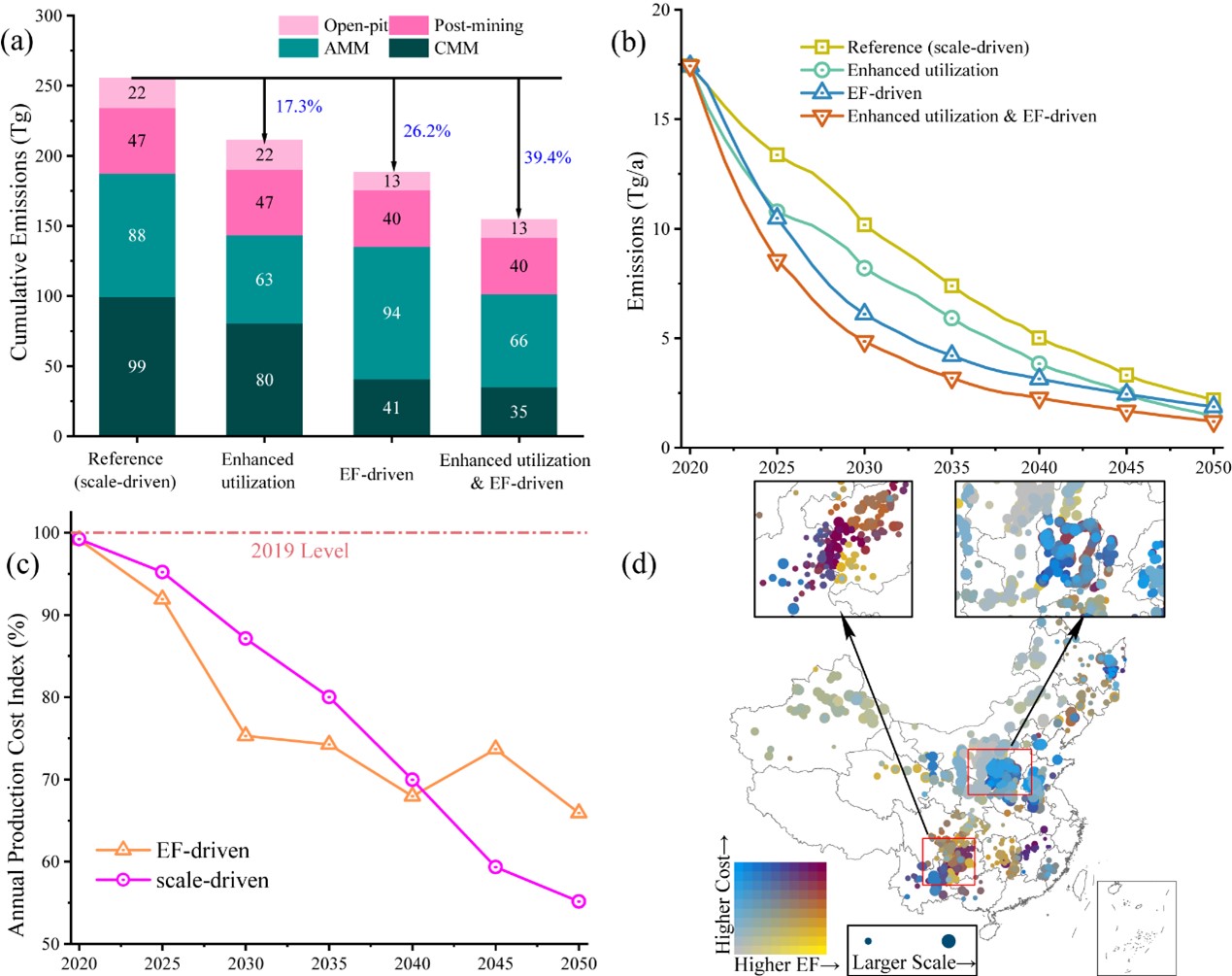 研究进一步比较了不同的煤矿关闭策略对煤矿甲烷排放的影响。研究发现,如果在未来优先关闭高瓦斯煤矿,将使得2020年至2050年间的累计甲烷排放减少26%,减排效果远大于回收矿井瓦斯并利用的传统减排举措。除了气候效益,该策略也将降低未来的煤炭生产成本。因此,中国当前的煤矿关闭策略(优先关闭小煤矿)可能已经不再适用。作为一种切实可行的替代方案,该研究建议优先关闭规模较小、瓦斯含量高、生产成本高的煤矿,主要位于西南地区,并将煤炭生产集中在西北和北部地区,这些地区的煤矿排放因子和生产成本较低,煤矿规模较大。