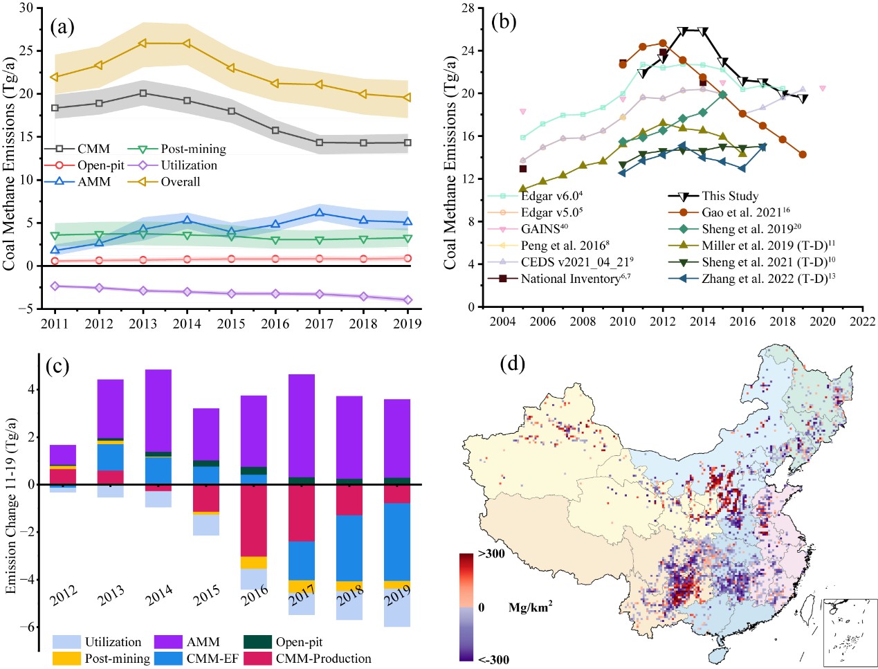 结果表明,中国在2011年至2019年间淘汰了大约1.2万个落后煤矿,这些关闭的煤矿排放了大量的甲烷,是此前研究估计的2-10倍。通过对废弃矿井甲烷排放的修正提升了现有清单的准确度和透明度,使得基于“自下而上”方法的甲烷排放清单数据与基于“自上而下”的反演研究结果的差异缩小了53%。研究还发现,由于关闭矿井的瓦斯含量通常较高,以及低甲烷排放的露天煤矿产量的增加,中国单位煤炭生产的平均排放因子从2013年到2019年间下降了23%。因此,虽然中国近年来煤炭产量还在增长,但煤炭甲烷排放已经达峰。