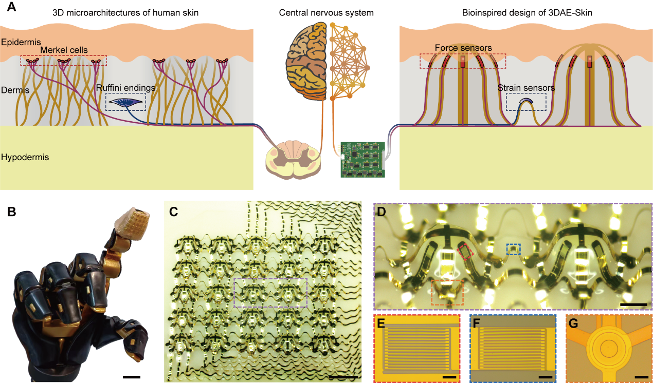 图1.具有三维架构的电子皮肤:仿生设计概念及真实器件图片。A图展示电子皮肤的仿生设计概念;B图为贴于机械手指尖的电子皮肤;图C-G为电子皮肤的照片、力传感单元与应变传感器局部放大图及应变栅线与过孔局部显微放大图片