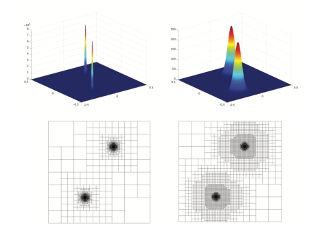 图2.连续型快速高斯变换的算例(格点数:4*10^6,容差:10^{-12}。)用户输入:分布函数f(左上),初始网格(左下);算法返回:积分变换(右上),自适应网格(右下)