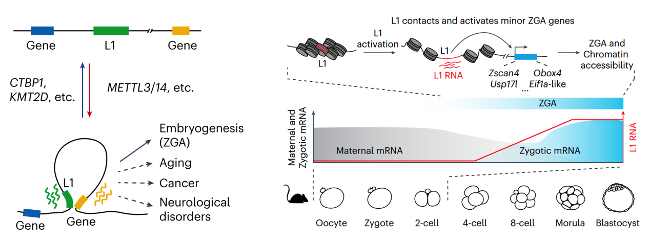图1.L1的转录水平被功能多样的基因所精密调控,也决定着L1选择性地接触并激活远程基因表达的功能,影响着早期胚胎发育中的ZGA,也可能影响衰老、癌症和神经系统性疾病等(左)。L1转录激活了小鼠早期胚胎发育中的第一波转录行为(minor ZGA)(右)