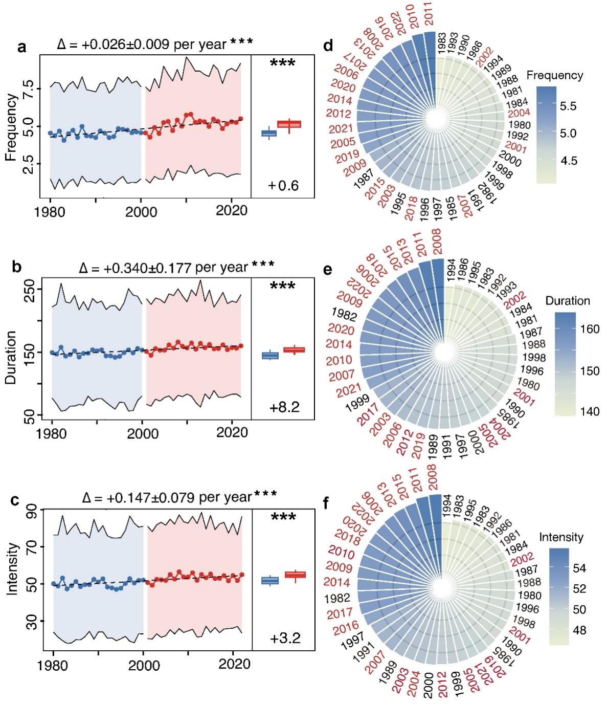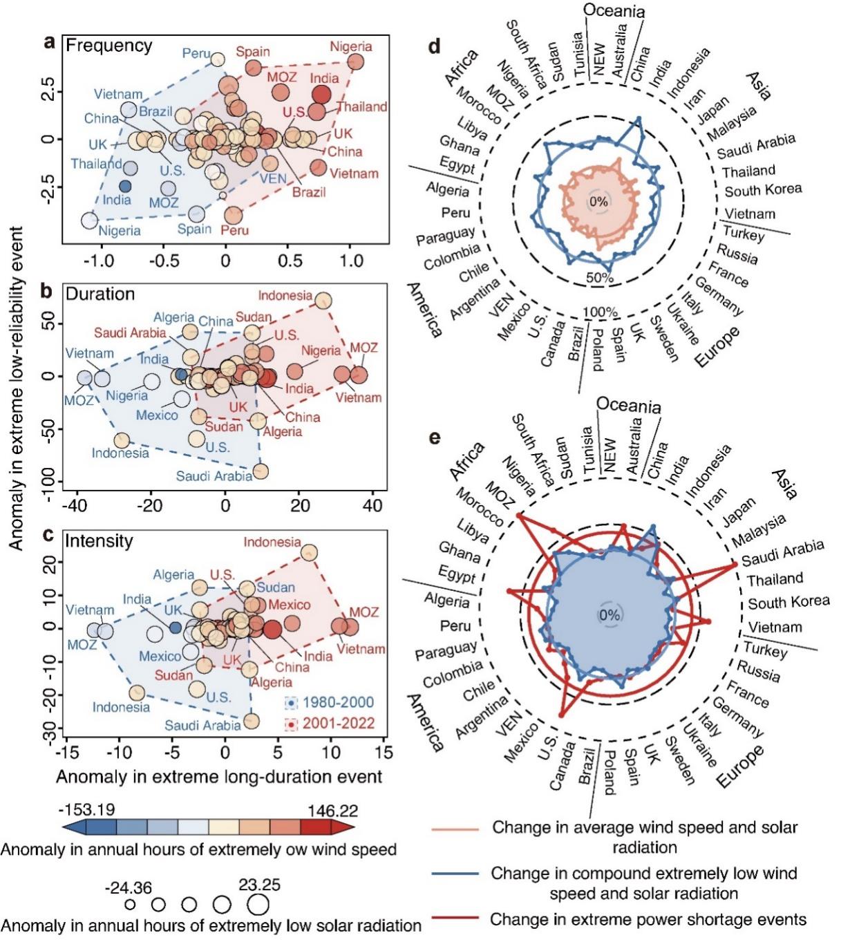 研究发现,气候变化背景下1980-2022年全球极端电力短缺事件持续增加。长时极端短缺事件的出现频次、持续时长和强度分别以每年0.026次、0.340小时和14.7%的速度增长,低可靠性极端短缺事件的出现频次、持续时长和强度分别以每年0.069次、0.392小时和13.1%的速度增长。在20年时间尺度上,2000年之后全球极端电力短缺事件显著高于2000年以前(图1)。