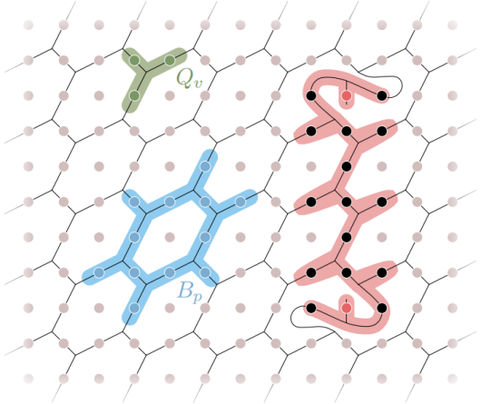 实验制备斐波那契非阿贝尔拓扑态以及实现斐波那契任意子的编织操作被广泛认为极为困难。该实验采用弦网凝聚模型,通过几何变换使得超导量子芯片方形格子上的量子比特与弦网模型中蜂窝形状的“弦”相吻合(图2)。在该模型中,系统哈密顿量由所有涡旋算符Qv和所有块算符Bp之和构成,基态中所有的弦均为闭合,而激发态中斐波那契任意子分布在开弦的两端(图2)。该实验使用了27个超导量子比特,单(双)比特门精度为99.96%(99.5%),通过115层量子线路制备了系统基态。