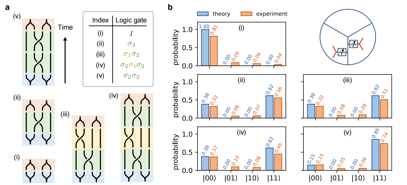 在制备基态之后,实验通过将系统分成不同区域的方法测量了拓扑纠缠熵,所得结果与理论预言吻合。在此基础上,实验通过弦算符操作产生了两对斐波那契任意子并展示了其编织操作(图3)。实验设计了多种不同的编织次序来测试斐波那契任意子的特性(图3a),分别为:(i)斐波那契任意子与其反粒子湮灭;(ii)编织改变融合结果;(iii)和(iv)融合结果相同验证Yang-Baxter方程;(v)测量斐波那契任意子的量子维度。实验所得结果均与理论预测吻合得很好(图3b),其中根据编制次序(v)的实验结果所得的斐波那契任意子量子维度为1.598,十分接近理论预言的黄金分割率1.618。