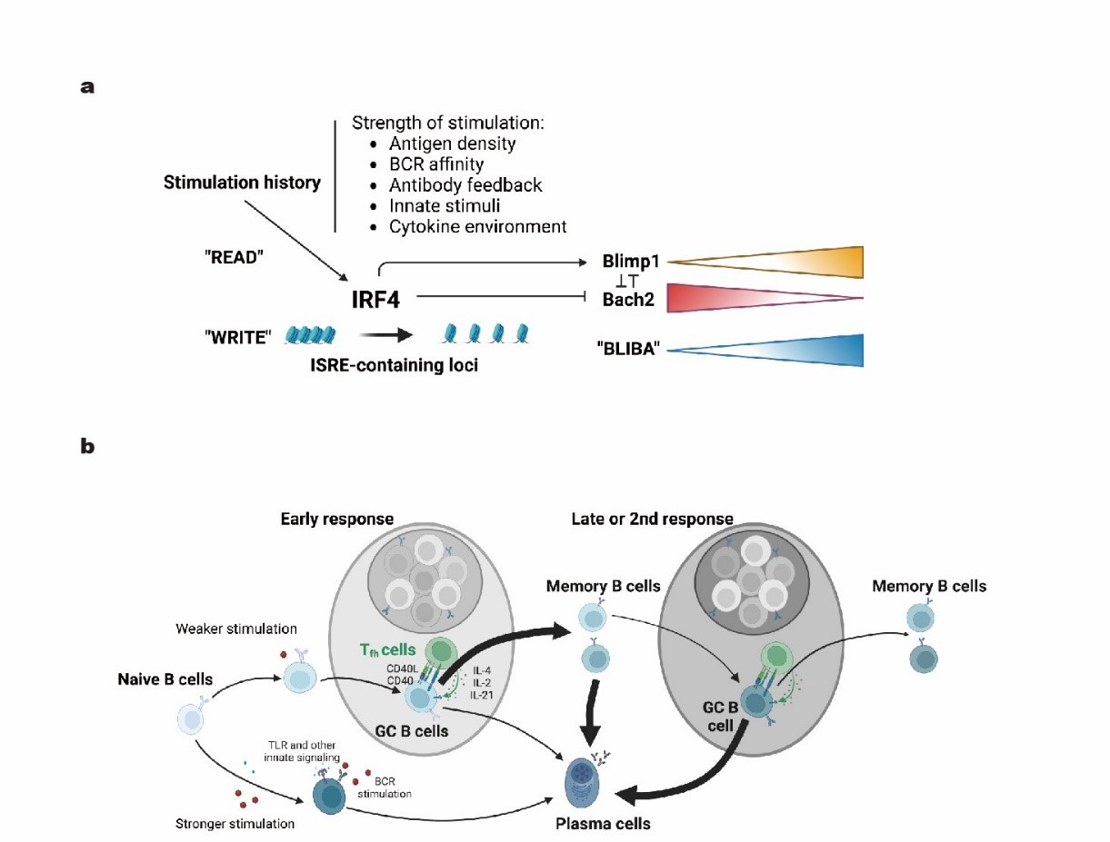 在B细胞中,有被称为BACH2和BLIMP1的两个蛋白质,它们分别是分化成GC B细胞和浆细胞所需要的核心转录因子。这两个因子彼此拮抗,构成了B细胞命运决定双向负反馈基因调控网络的一部分。在生命系统中,双向负反馈基因调控网络会导致性状出现“开关”式的飞跃变化。通过构建新型荧光报告系统和可诱导基因表达的小鼠模型,祁海教授团队发现,BLIMP1表达升高时,记忆B细胞更易于成为浆细胞,而BACH2表达升高时它们更容易成为GC B细胞。通过一种检测染色质开放程度的实验方法(一般越开放的染色质越利于基因表达上调),他们进一步发现,记忆B细胞每经历一次免疫刺激,这个经历都会被一个称为IRF4的重要转录调控因子通过表观遗传印迹记录下来,而这一印迹记录控制着细胞中BLIMP1和BACH2的相对表达水平以及上调潜力。结果是,IRF4会导致BLIMP-1-BACH2的相对表达量(BLIBA)随着B细胞分化和免疫反应的进程逐渐上升,使得记忆B细胞在接受下一次刺激后成为GC B细胞的机会进行性下降,而一跃变成浆细胞的可能进行性升高。