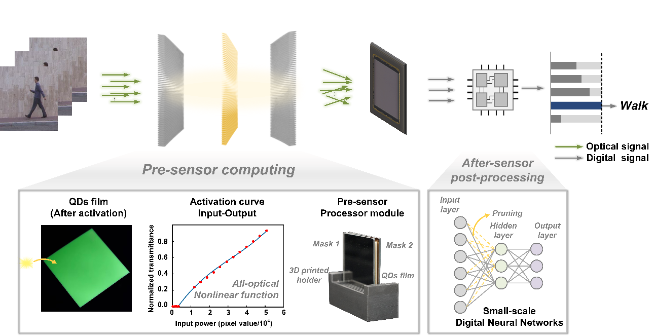 mk(中国)网7月30日电 在物联网时代,视觉图像传感器作为智能社会的关键设备,被嵌入到诸如移动通信终端、智能穿戴设备、汽车和工业机器等各种设备中。随着应用的不断扩展,对传感器的系统功耗、响应速度、安全性能等方面也提出了更高的要求。而在传统的“感传算”链路中,内存的访问速度和通信带宽逐渐成为了限制系统功耗及速度的主要瓶颈。将计算单元向传感单元靠近,使系统的近传感端拥有一定的数据处理能力,逐渐成为解决这一问题的有力途径。感前光计算相比于其他近感计算方式,具有高速、高带宽、低功耗的优势。然而,目前绝大部分光神经网络需要相干激光作为光源,硬件系统笨重复杂,且仅能完成线性运算,缺乏层间非线性激活,限制了感前光计算在边缘场景的应用。