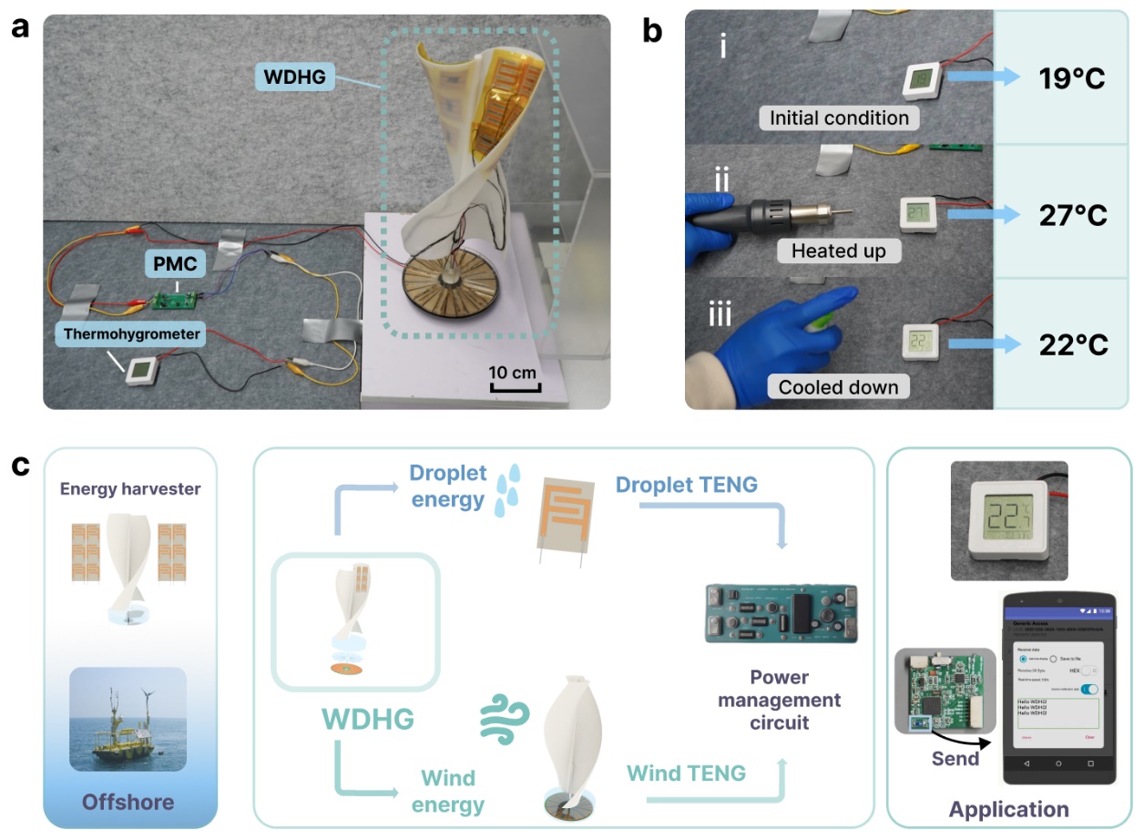 (a)WDHG应用测试平台;(b)驱动数字式温湿度计的测试结果;(c)基于WDHG的自供电系统在海上环境中的工作示意图