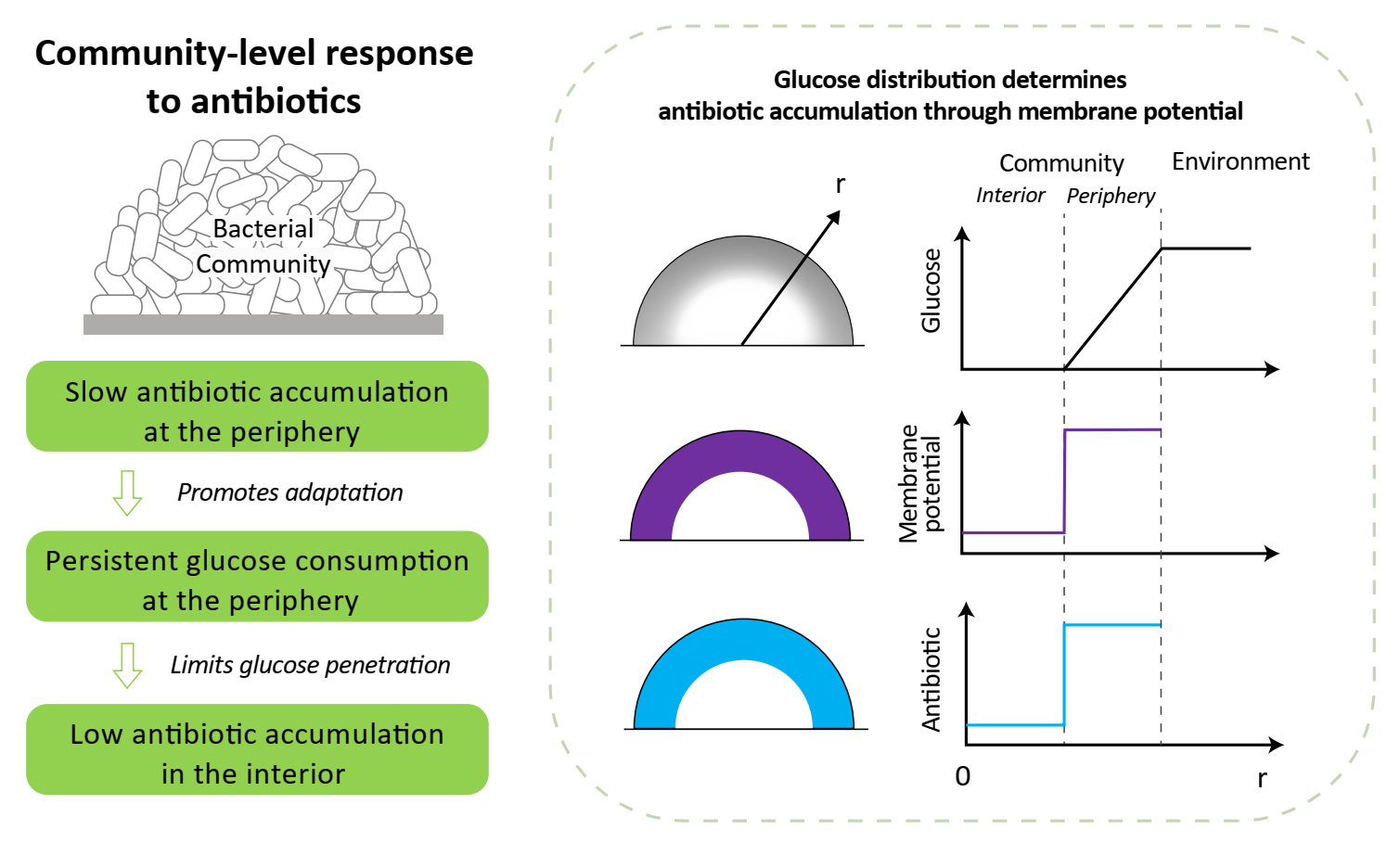 课题组研究了抗生素在大肠杆菌生物被膜群体中的空间分布,发现以四环素为代表的多种抗生素富集在细菌群体的外围区域,然而在内部区域的富集程度较低。这种空间差异性的富集取决于支持群体生长的碳源葡萄糖的空间分布。由于细菌的紧密聚集,葡萄糖在群体内存在由外到内浓度递减的空间梯度。在群体的外围区域葡萄糖较为充足,而群体内部区域葡萄糖匮乏。这种营养的空间分布通过影响细菌的膜电势决定了抗生素在群体中的空间分布。