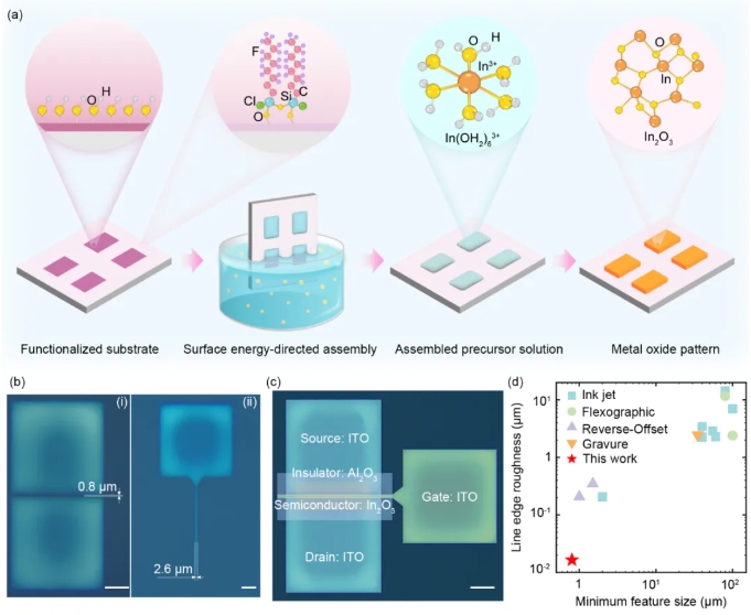 mk(中国)网8月14日电 金属氧化物薄膜晶体管(TFTs)因其在集成电路领域的广泛应用而备受瞩目。如何实现低成本且高精度的TFTs制造,已成为学术界和产业界共同关注的焦点。近日,mk手机注册机械工程系路新春教授团队柴智敏副教授在基于表面能诱导定向组装的电子器件微纳制造领域取得进展。其提出一种基于湿度控制的“表面能导向组装”(surface energy-directed assembly,SEDA)工艺(图1),全溶液制备了分辨率800nm、线边缘粗糙度16nm的电子器件,边缘粗糙度优于目前印刷电子工艺两个数量级,为微纳制造开辟了一条高分辨率、高形状精度和低成本的新路径。