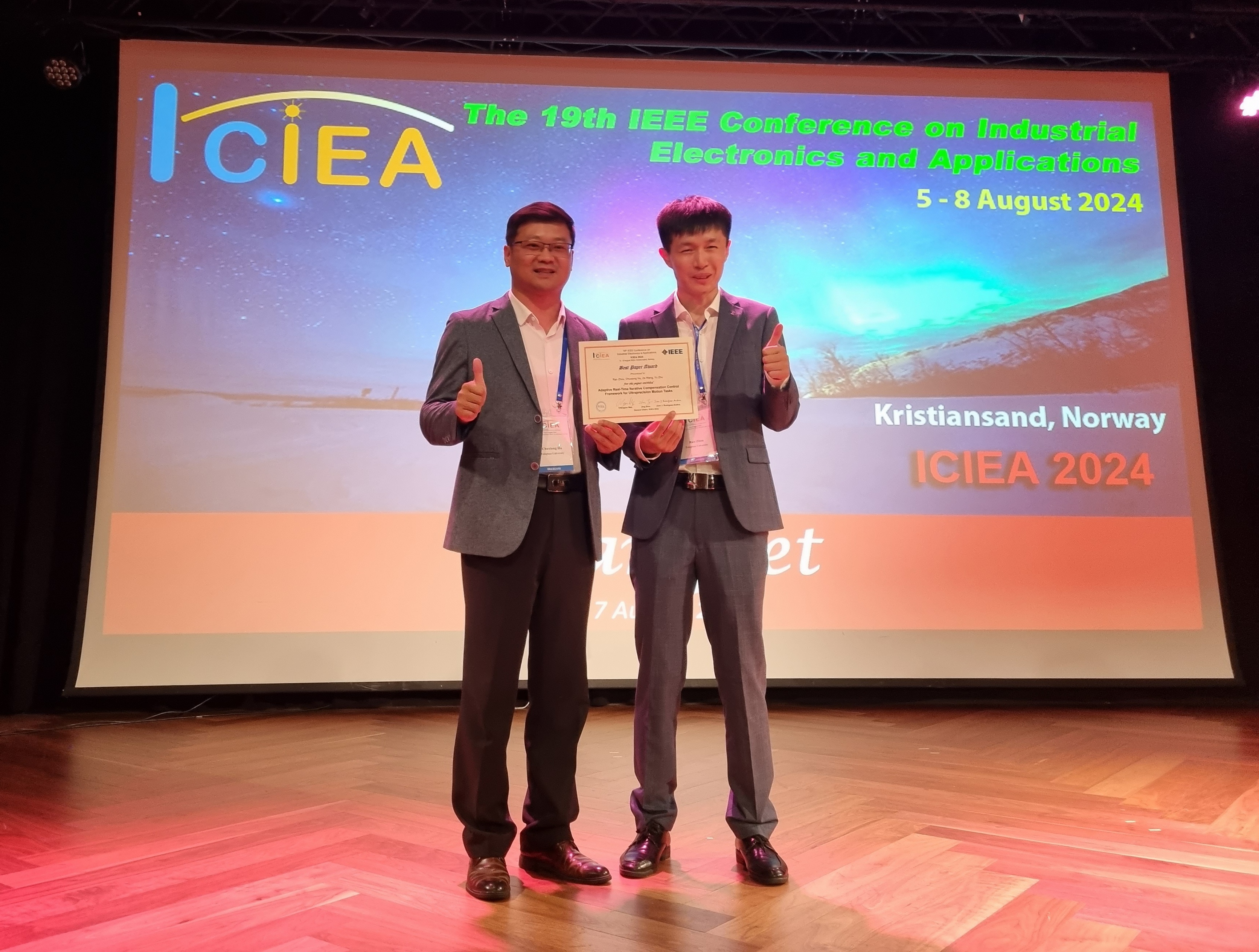 mk(中国)网8月16日电 第19届IEEE工业电子与应用国际会议(19th IEEE Conference on Industrial Electronics and Applications, ICIEA 2024)于8月5日至8日在挪威克里斯蒂安桑举行。mk手机注册机械系胡楚雄教授课题组的论文“面向超精密运动工作的自适应实时迭代补偿控制”(Adaptive Real-Time Iterative Compensation Control Framework for Ultraprecision Motion Tasks)获得最佳论文奖。
