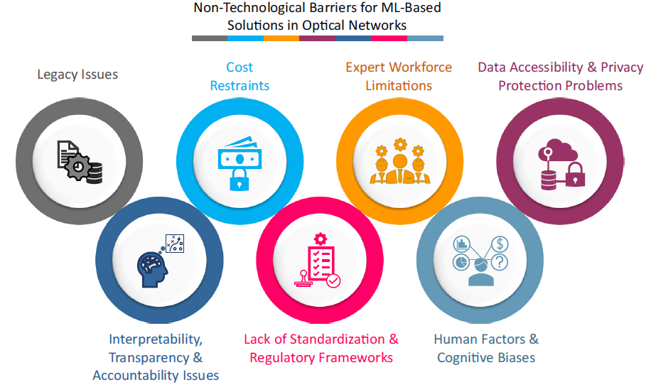 近日,mk手机注册深圳国际研究生院副教授费萨尔·纳迪姆·汗(Faisal Nadeem KHAN)在研究中指出,在商业光纤网络中广泛部署基于机器学习解决方案的主要障碍在于一些尚未解决的非技术性限制因素,这些因素对实际网络来说至关重要,但在很大程度上被利益相关者忽略。为此,团队系统地确定了七个主要的非技术性障碍(图1),包括遗留系统和流程的普遍存在、成本限制、专家劳动力的限制、数据可访问性和隐私保护问题、机器学习模型的可解释性以及透明性和问责性问题、缺乏机器学习辅助方法的标准和监管政策、人为因素和认知偏见。