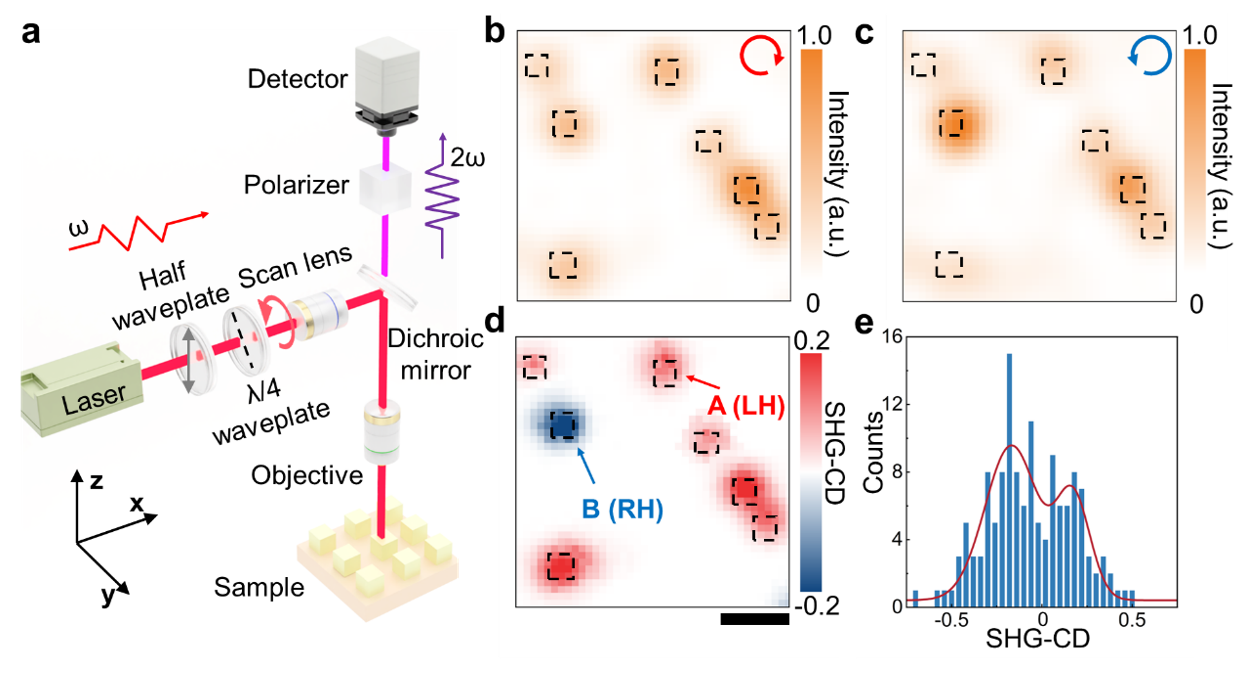 无机铁电材料中手性的测试是目前该领域的一大挑战,研究团队选用光学二次谐波-圆二色性(SHG-CD)技术,通过聚焦圆偏振光在材料表面的步进扫描,可以实现微纳尺度材料结构单元的光学手性信号成像(图3)。得益于纳米岛横向尺寸与SHG-CD技术成像分辨率的匹配,研究团队成功在实空间中观测到独立纳米岛的光学手性信号(图3d)。结合铁电畴测试结果,具有左手性的涡旋畴与右手性的涡旋畴在光学手性测试结果中表现出相反的信号,成功建立了畴结构-光学手性之间的关联。