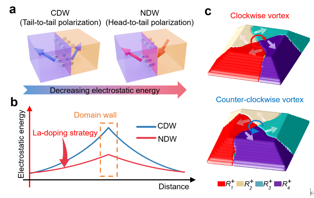 图1.通过调制静电能在La掺杂BiFeO3纳米岛中产生铁电涡旋畴