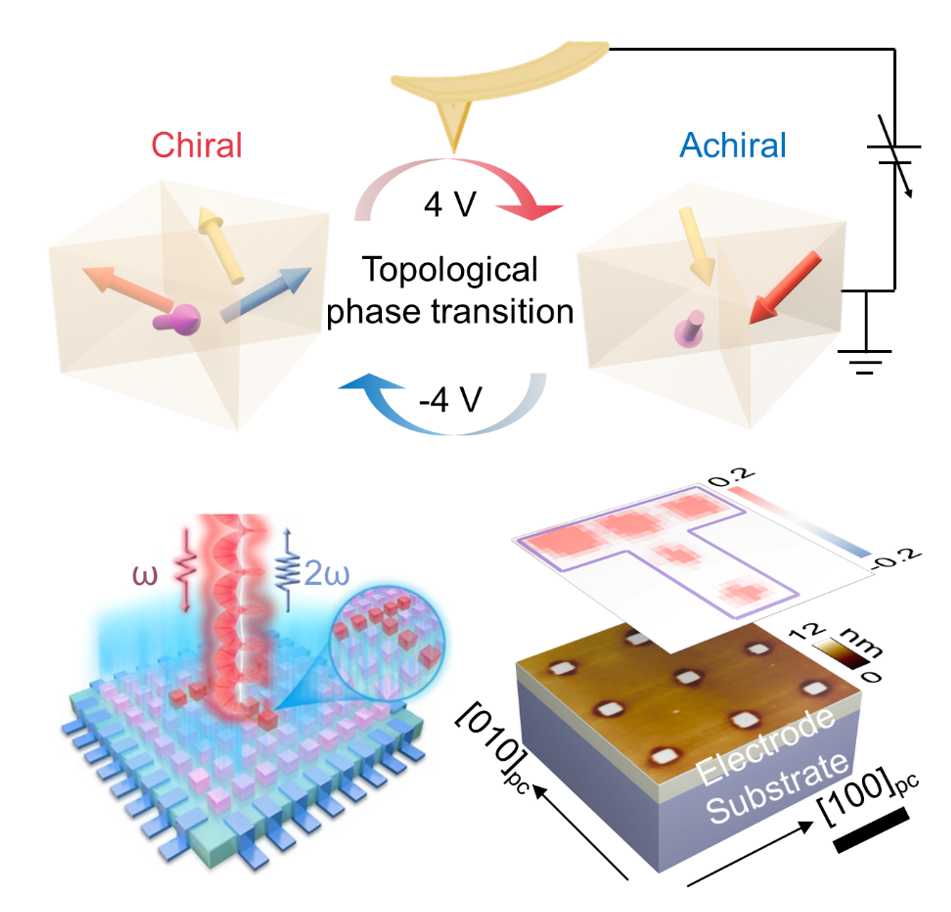 考虑到铁电极化与光学手性之间的强关联机制,研究团队进一步探究了外加电场对涡旋畴和光学手性信号的调控(图4)。结果表明,在外电场作用下,LBFO纳米岛中的手性涡旋畴可与非手性的拓扑平庸畴之间可逆且非易失转换,由此实现光学手性信号的产生与擦除。采用团队前期提出的纳米岛阵列化策略,具有手性的纳米岛可以制备为有序阵列器件原型,并具有电写光读的功能特性,有望在光学、超材料等领域产生新的应用。该研究为设计和开发无机手性铁电材料提供理论和材料基础,助力开发基于手性铁电拓扑畴的新型集成光电子器件,推动手性铁电材料的进一步发展和应用。