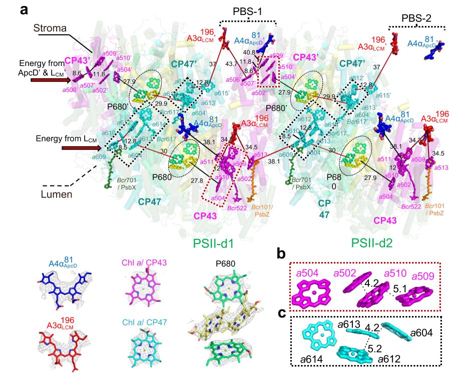 图3.原位蓝藻PBS-PSII超级复合体中的色素排布