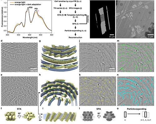 mk(中国)网8月26日电 藻胆体(phycobilisome, PBS)是蓝藻和红藻主要的捕光天线,通过共价连接的色素团(bilins)将捕获的光能以极高的效率传递至光系统II(photosystem II, PSII)和光系统I(photosystem I, PSI)的反应中心以诱导光-化学能量的转化。虽然大多数光合作用相关蛋白复合物的结构已通过体外纯化的方式得到了解析,但在细胞内的天然状态下它们之间相互作用的方式以及能量传递的途径尚未得到解释。