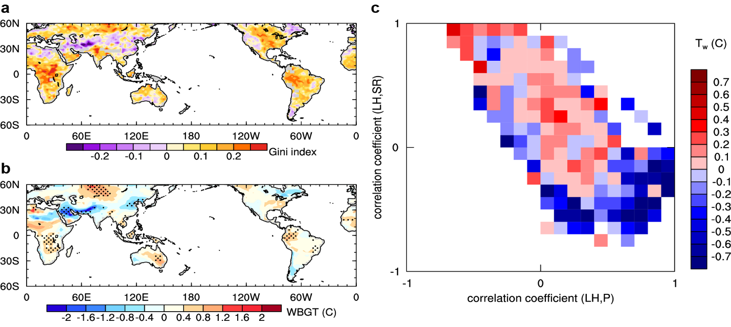 图3.过多小雨被抑制后暖季(a)小雨Gini系数的变化和(b)WBGT的变化(c)及其所在的不同蒸散发约束区间(横坐标越接近于1代表蒸散发越受水分约束,纵坐标越接近于1代表蒸散发越受能量约束)