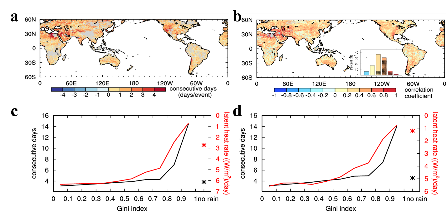 图2.(a)发生小雨的连续湿热浪和无雨的连续湿热浪持续时间差异;(d)连续湿热浪与小雨Gini系数(表征小雨分布情况,系数越大代表小雨分布越不均匀)的相关系数;(c-d)热带(c)和中高纬(d)连续湿热浪和潜热变化速率与小雨Gini系数的关系