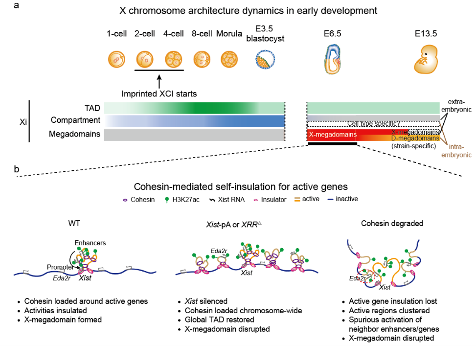 mk手机注册生命科学学院颉伟实验室和合作者前期围绕染色体三维结构在哺乳动物生殖和胚胎发育过程中的变化规律和功能进行了一系列研究,包括精子发生、卵子发生、着床前胚胎、着床后胚胎和核移植过程等。然而,染色体三维结构在雌性胚胎发育早期X染色体失活过程中的动态变化过程、机制和功能仍不清楚。