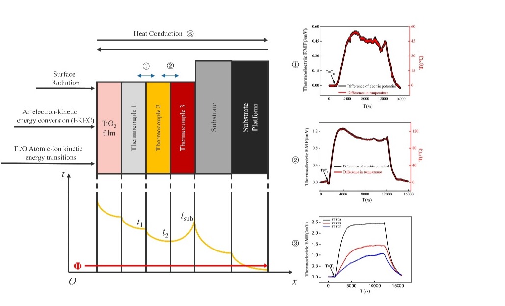 研究人员通过NiCr/NiSi薄膜和标准K型贴片热电偶测量了TiO2薄膜的生长表面温度和基底温度。在TiO2薄膜沉积过程中,热能主要被薄膜生长表面吸收。从薄膜生长表面到薄膜生长基板存在较大的温度梯度。薄膜生长表面的温度显著高于基板温度。结合TiO2薄膜生长表面的温度,薄膜生长表面的温度起着关键作用。