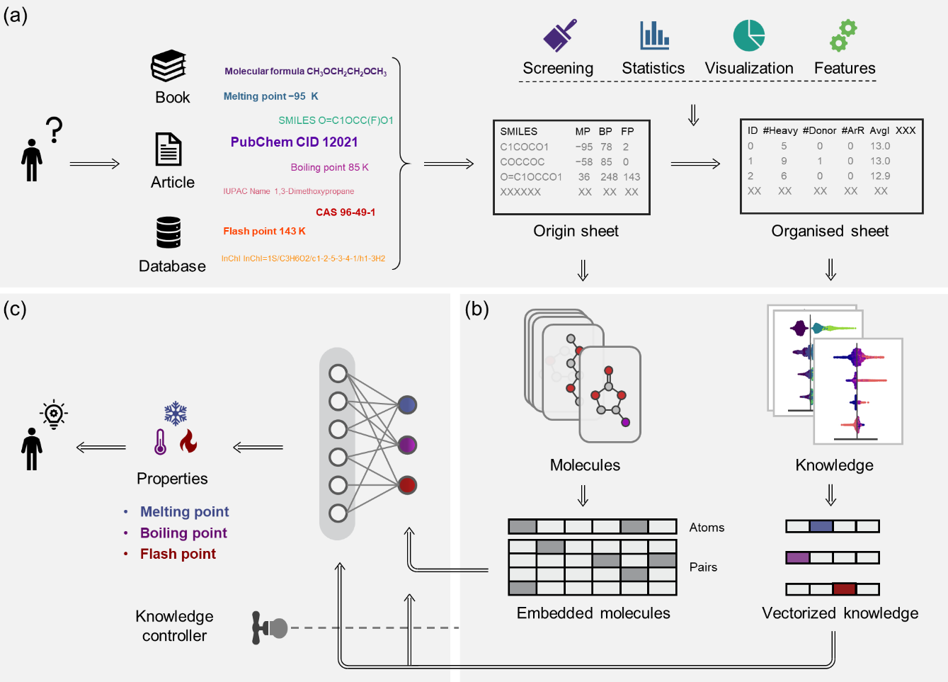 图1.知识和数据双驱动的二次电池电解液分子性质预测框架