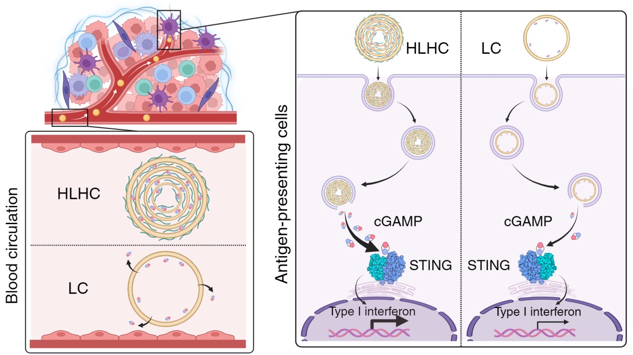 通过系统给药激活肿瘤组织内抗原呈递细胞(APCs)的STING通路可促进I型干扰素产生,进而提高抗肿瘤免疫应答,是一种极具潜力的肿瘤治疗策略。然而,大多数STING激动剂(如cGAMP)是带负电的亲水性小分子,在系统给药后易从体内快速清除。此外,这类分子透过生物膜的效率低,难以高效到达APCs细胞质激活STING通路。虽然科学家们开发了多种不同种类的脂质或聚合物纳米粒以提高药物向细胞质的递送效率,但这些纳米粒依然面临诸多挑战。例如在靶细胞内可实现高效细胞质递送的纳米粒在血液循环中容易过早释放药物,而在血液循环中稳定的纳米粒难以在靶细胞内实现高效的细胞质递送。如何兼顾纳米粒的稳定性和高效的细胞质递送依然是亟待解决的问题。