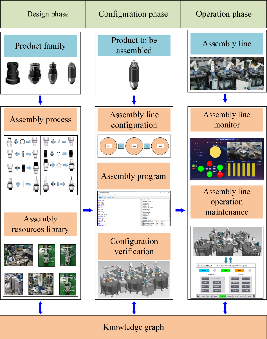 重构技术实现框架属于决策要素,根据各种装配决策方法的应用阶段,该框架分成设计、配置和操作三个阶段,为用户针对新产品的产线重构提供系统化的指引。在设计阶段,将产品装配中涉及到的各种装配信息(如装配过程、装配步骤、装配动作和规则)总结并存储到知识图谱中,并设计各种支撑资源库。在配置阶段,获得具有最佳布局的装配线,自动生成的装配程序,并使用虚拟调试技术优化形成最终的装配方案。在运行阶段,创建装配线的数字孪生模型,应用装配线运维和决策技术提高产线稳定性、灵活性和智能性。