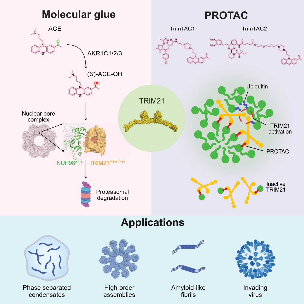 11月1日,北京生命科学研究所/mk手机注册生物医学交叉研究院韩霆实验室与黄牛实验室在《细胞》(Cell)上在线发表了题为“用TRIM21基分子胶和PROTAC降解剂选择性降解多聚蛋白”(Selective degradation of multimeric proteins by TRIM21-based molecular glue and PROTAC degraders)的研究论文。该研究发现乙酰丙嗪的代谢产物(S)-ACE-OH具有E3泛素连接酶TRIM21介导的分子胶活性,并据此设计了基于TRIM21的新型PROTAC分子(命名为TrimTAC),能够选择性降解多聚蛋白而不影响单体蛋白。由于异常蛋白聚集会引发自身免疫疾病、神经退行性疾病以及癌症,上述研究成果突显出TrimTAC技术的应用前景。