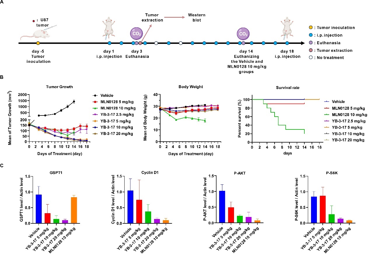 最后,研究人员评估了YB-3-17在小鼠模型上的体内抗肿瘤活性。尽管MLN0128和YB-3-17均显著抑制了肿瘤生长,然而,YB-3-17在相等剂量下表现出更强的疗效,例如2.5mg/kg的YB-3-17产生了与10mg/kg的MLN0128相当的肿瘤抑制效果。值得一提的是,10/20mg/kg的YB-3-17几乎完全阻止了肿瘤的生长,并导致肿瘤消退,且小鼠状态良好(图4B),显示了YB-3-17在体内强效的抗肿瘤能力及可靠的安全性。与溶媒组相比,YB-3-17显著抑制了mTOR下游蛋白的磷酸化,并以剂量依赖的方式降解GSPT1(图4C)。