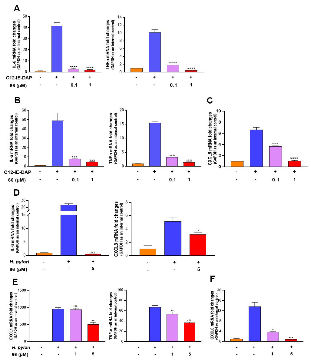 NOD1信号通路被激活后能引起IL-6、TNF-α及CXCL1/8等炎性细胞因子的表达和分泌。RT-qPCR实验结果显示化合物66可显著抑制由C12-iE-DAP及H.pylori刺激引起的免疫细胞(THP-1, BMDM)及胃上皮细胞(AGS)炎症因子的转录水平,说明66具有较好的体外抗炎效果(图4)。
