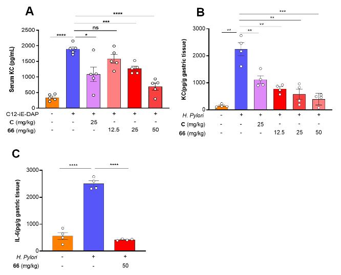 为了评价化合物66体内抗炎效果,研究人员建立了由C12-iE-DAP刺激引起NOD1信号通路激活的小鼠全身性炎症模型,以及由H. pylori感染引起的小鼠胃炎模型。实验结果显示,66通过口服给药可显著抑制小鼠血清KC水平以及胃组织KC、IL-6的分泌(图5)。