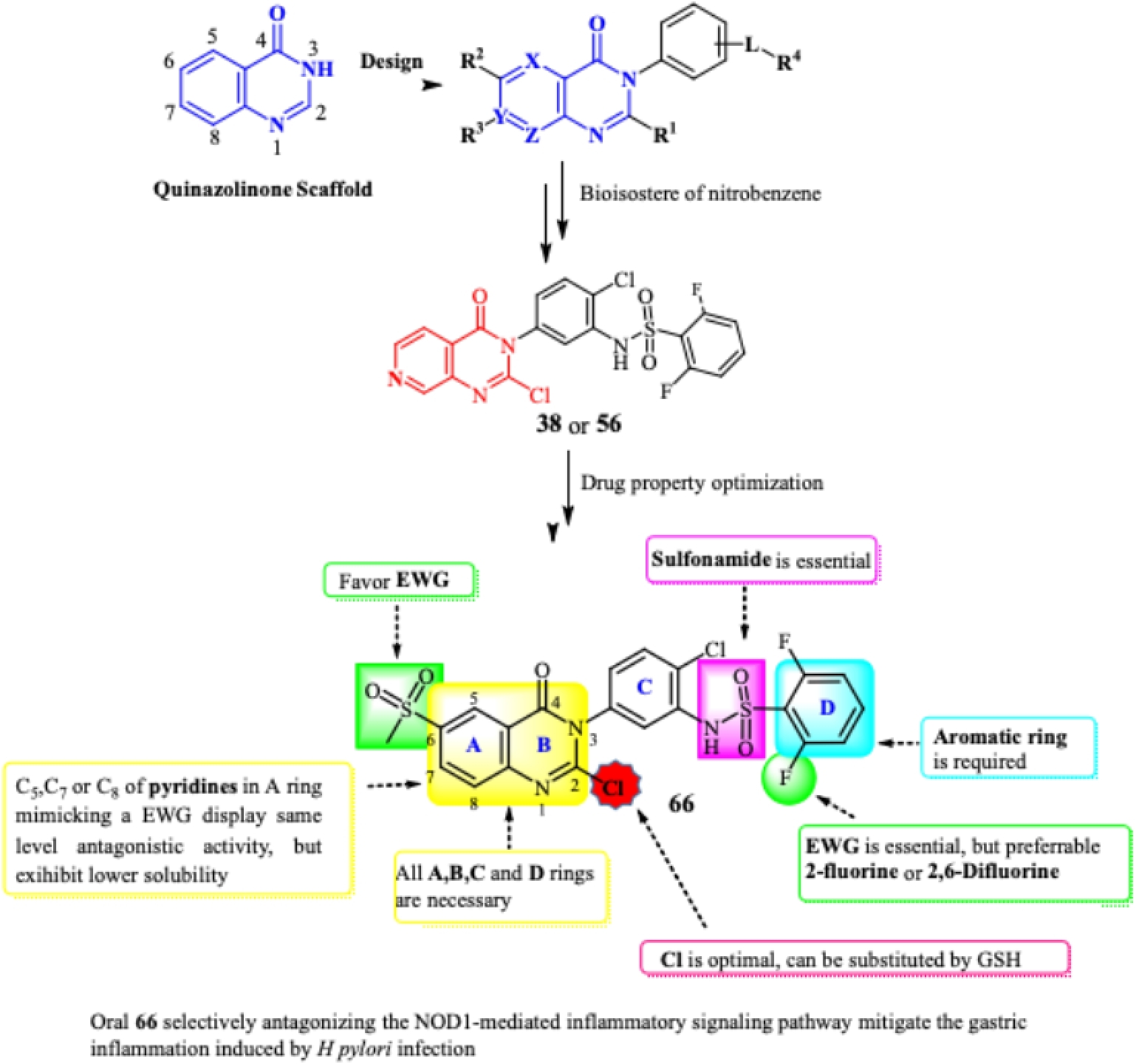 研究发现了新型、高活性和高选择性的NOD1拮抗剂,化合物66在细胞水平及小鼠体内展现了非常好的口服抗炎药效,同时发现通过选择性拮抗NOD1炎症信号通路可抑制H.pylori感染引起的胃部炎症,为H.pylori感染引起的胃炎的治疗奠定了一定的基础。