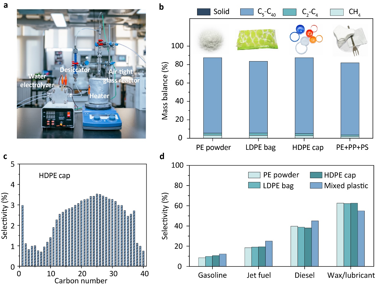近日,mk手机注册化工系牛志强课题组在废旧塑料催化升级回收领域取得重要进展,在低氢气压力甚至常压条件下,将废弃聚乙烯(PE)高选择性地转化为液体燃料、蜡和基础油,提出并验证了“绿氢+废塑料=液体燃料”的分散式资源升级回收路线(图1)。