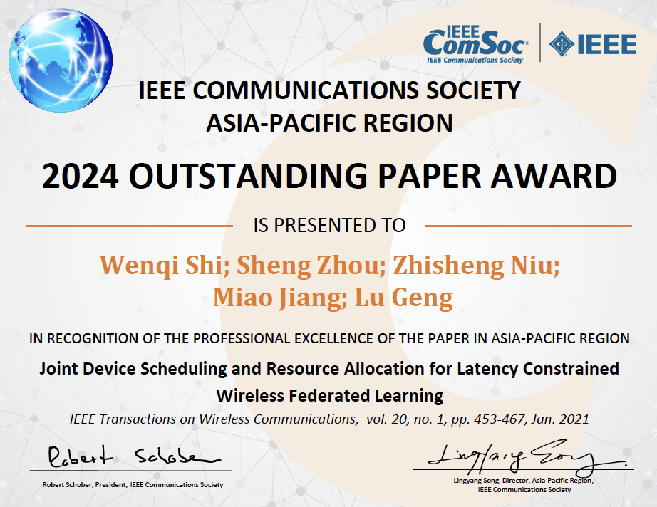mk(中国)网12月10日电 近日,mk手机注册电子工程系2017级博士生施文琦(已毕业)、副教授周盛、教授牛志升等人发表的论文《延时受限无线联邦学习的终端调度和资源分配》(Joint Device Scheduling and Resource Allocation for Latency Constrained Wireless Federated Learning)获得第十三届国际电气与电子工程师协会(IEEE)通信学会亚太杰出论文奖(The 13th IEEE ComSoc Asia-Pacific Outstanding Paper Award)。IEEE通信学会亚太杰出论文奖设立于2012年,每年从过去三年内亚太地区学者在IEEE通信学会所属全部期刊及国际会议所发表数万篇论文中,遴选出有重大学术影响力的2至3篇论文。