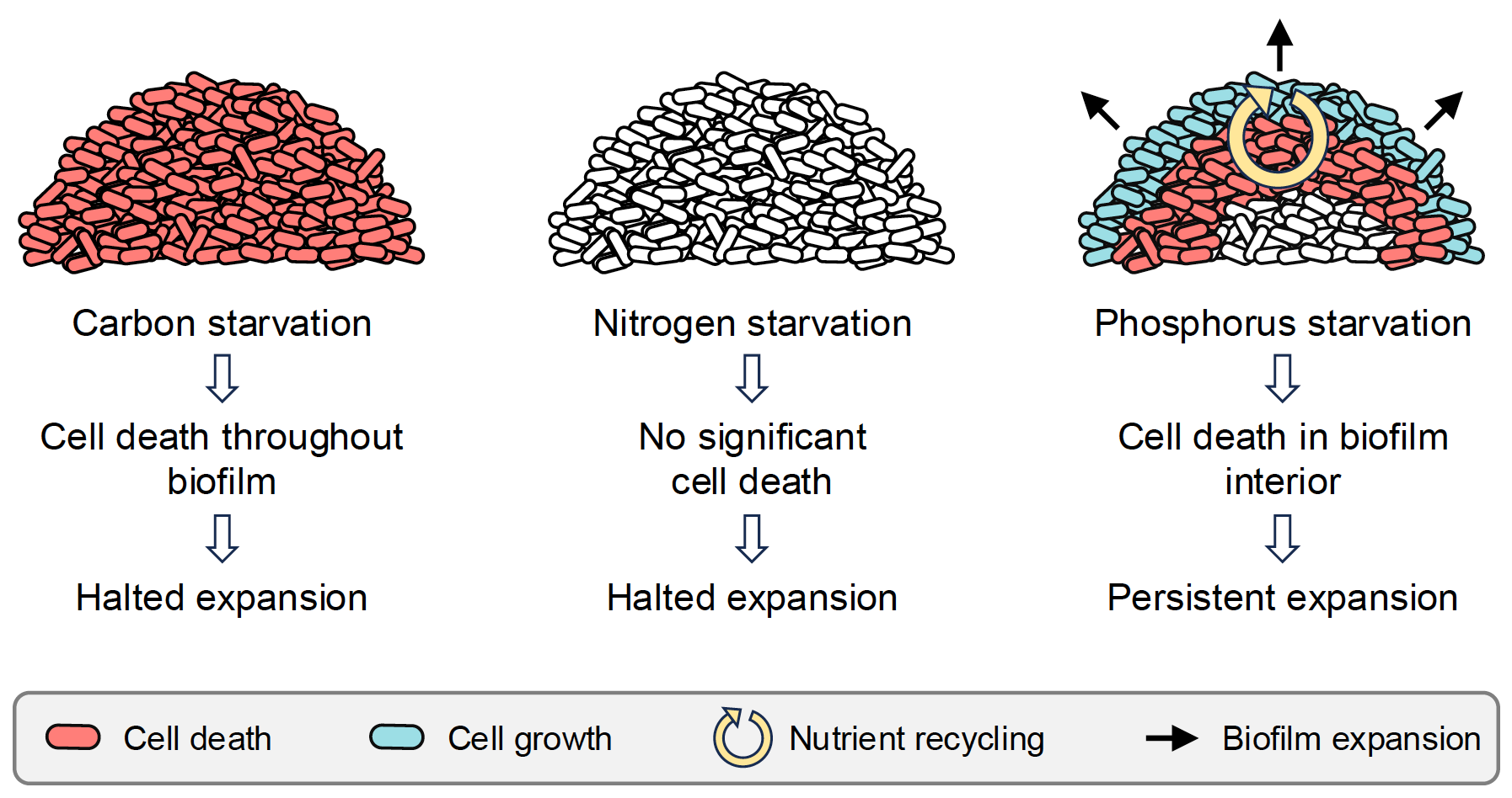 研究人员以大肠杆菌生物被膜为研究模型,发现环境中的磷供给缺乏时,生物被膜仍然能够维持长时间的扩张。通过代谢组学的方法发现,磷供给缺乏导致生物被膜中的胞外磷脂水平显著增加。进一步研究发现,这些磷脂来自活性氧介导的细菌死亡。生物被膜通过回收死亡细菌所释放出的磷以维持持续性的扩张。