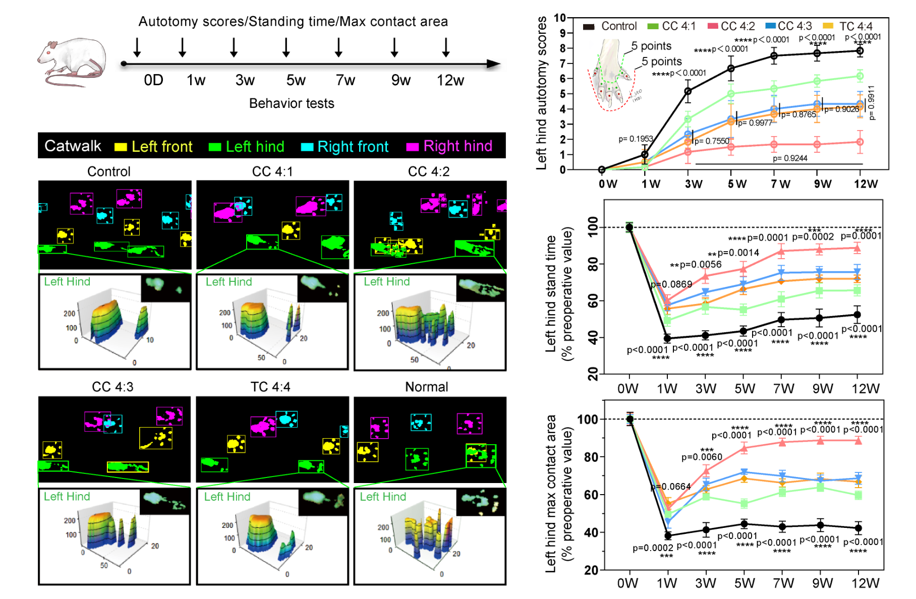 图2.自嗜评分和步态行为学评价表明空间约束套管有效减轻神经疼痛
