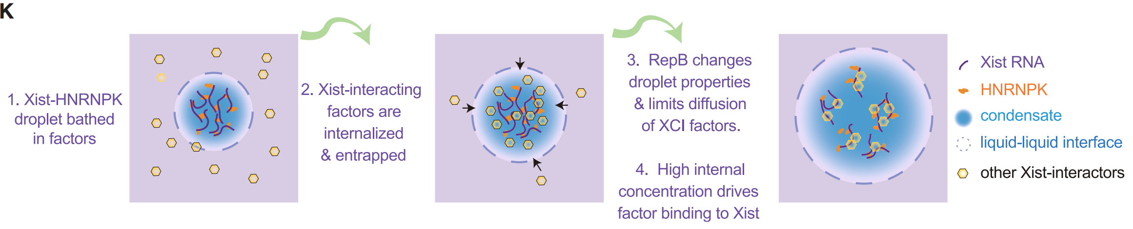 图3 HNRNPK-Xist形成特化相分离,促发并维持Xist的限制性扩散与X染色体基因沉默