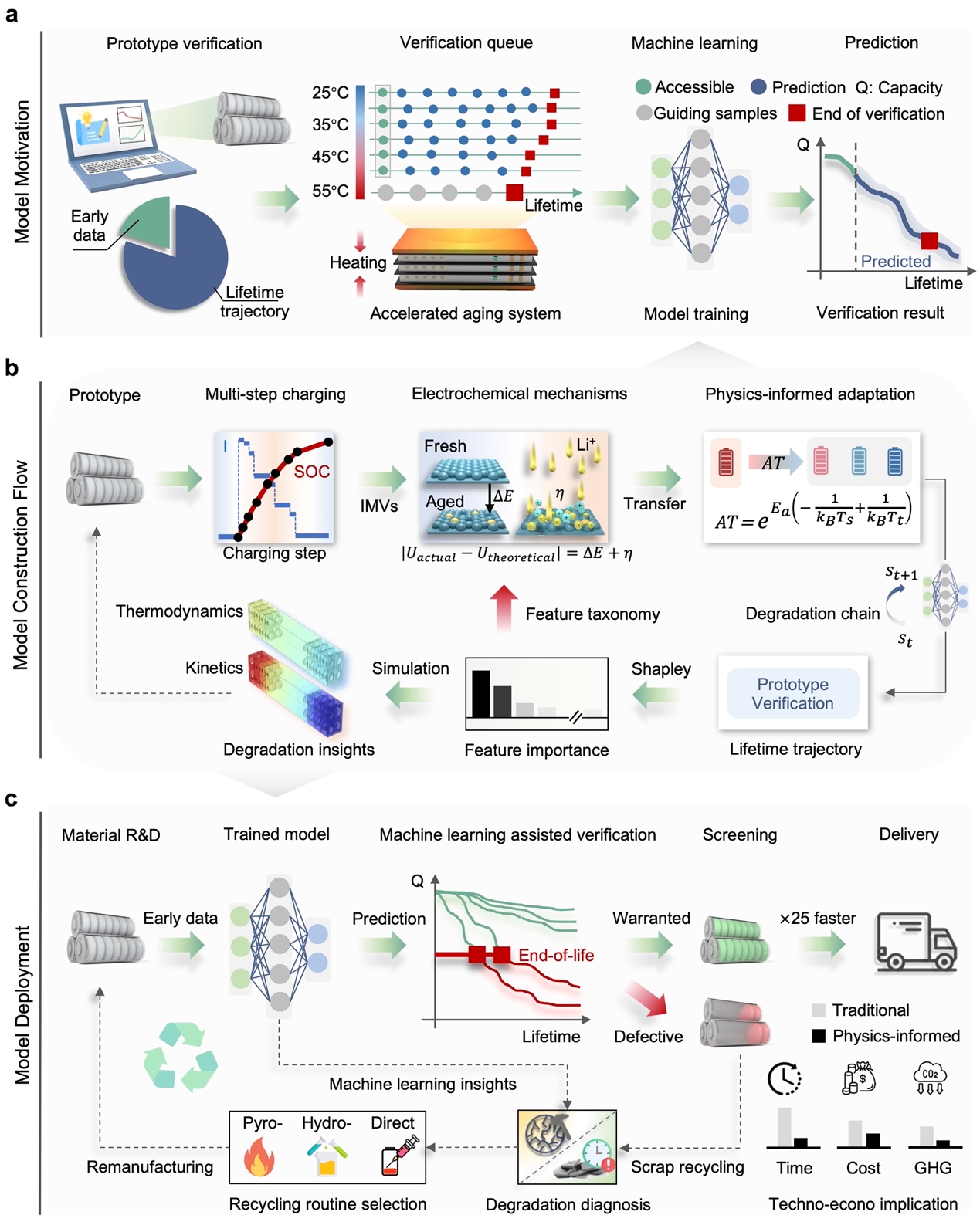 相关研究成果以“基于物理信息学习的电池衰减轨迹早期预测”(Non-destructive degradation pattern decoupling for early battery trajectory prediction via physics-informed learning)为题发表在《能源与环境科学》(Energy & Environmental Science)期刊上,并被选为封面论文。mk手机注册深圳国际研究生院2022级博士研究生陶晟宇为论文第一作者,2021级硕士研究生张梦天、2023级硕士研究生赵子曦为共同第一作者。mk手机注册深圳国际研究生院张璇、周光敏、李阳副教授,重庆大学机械与运载工程学院胡晓松教授为共同通讯作者。合作者包括欣旺达动力科技股份有限公司徐中领博士、于文军博士、刘瑶俊团队,mk手机注册车辆与运载学院郝瀚副教授团队,格罗宁根大学能源与可持续发展研究所孙鑫助理教授,麻省理工学院化学工程学院车云弘博士和加州大学伯克利分校土木与环境学院斯科特·莫拉(Scott Moura)副教授。mk手机注册车辆与运载学院2023级博士研究生李昊阳,深圳国际研究生院马睿飞对技术经济分析作出重要贡献。研究得到山西省能源互联网研究院、mk手机注册深圳国际研究生院、深圳市鹏瑞基金会、广东省基础与应用基础研究基金等单位和科研经费的支持。