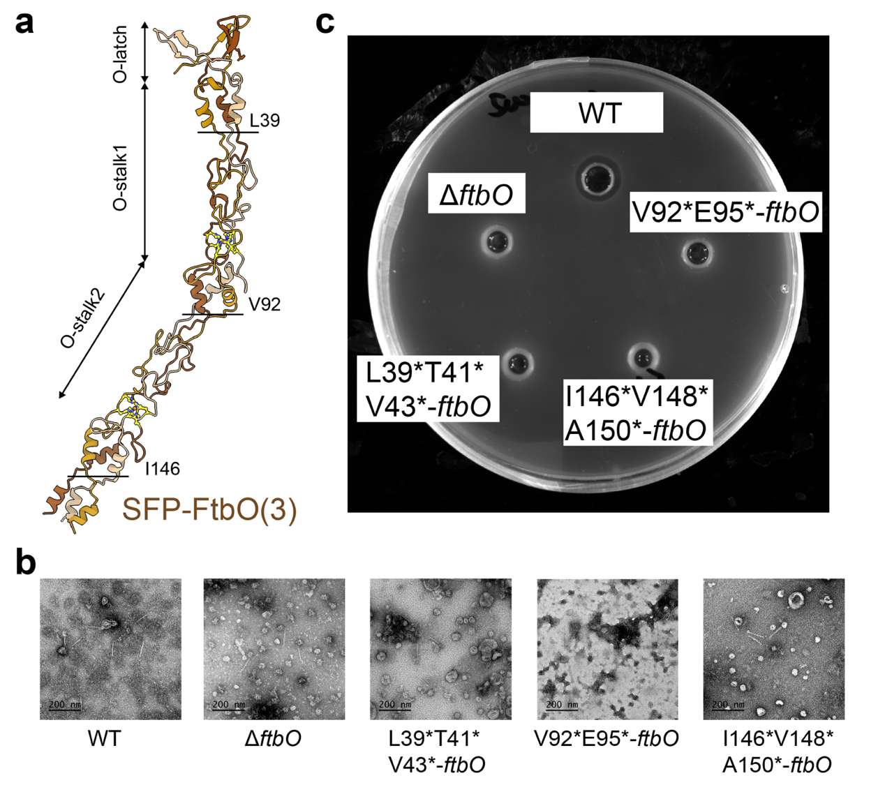 侧纤维中,FtbP蛋白三聚体末端的受体结合域(RBD)可精准锚定宿主细胞。侧纤维的另一组分FtbO蛋白三聚体通过铁离子配位稳定结构。实验表明,截短或删除FtbO不影响Monocin整体的结构组装,但会破坏其杀菌活性(图2),表明FtbO可能在杀菌过程中发挥重要功能。