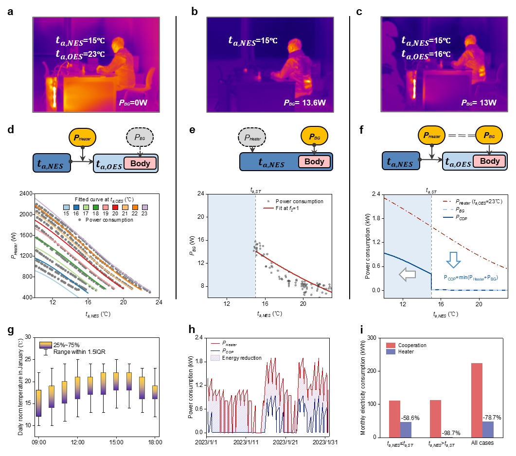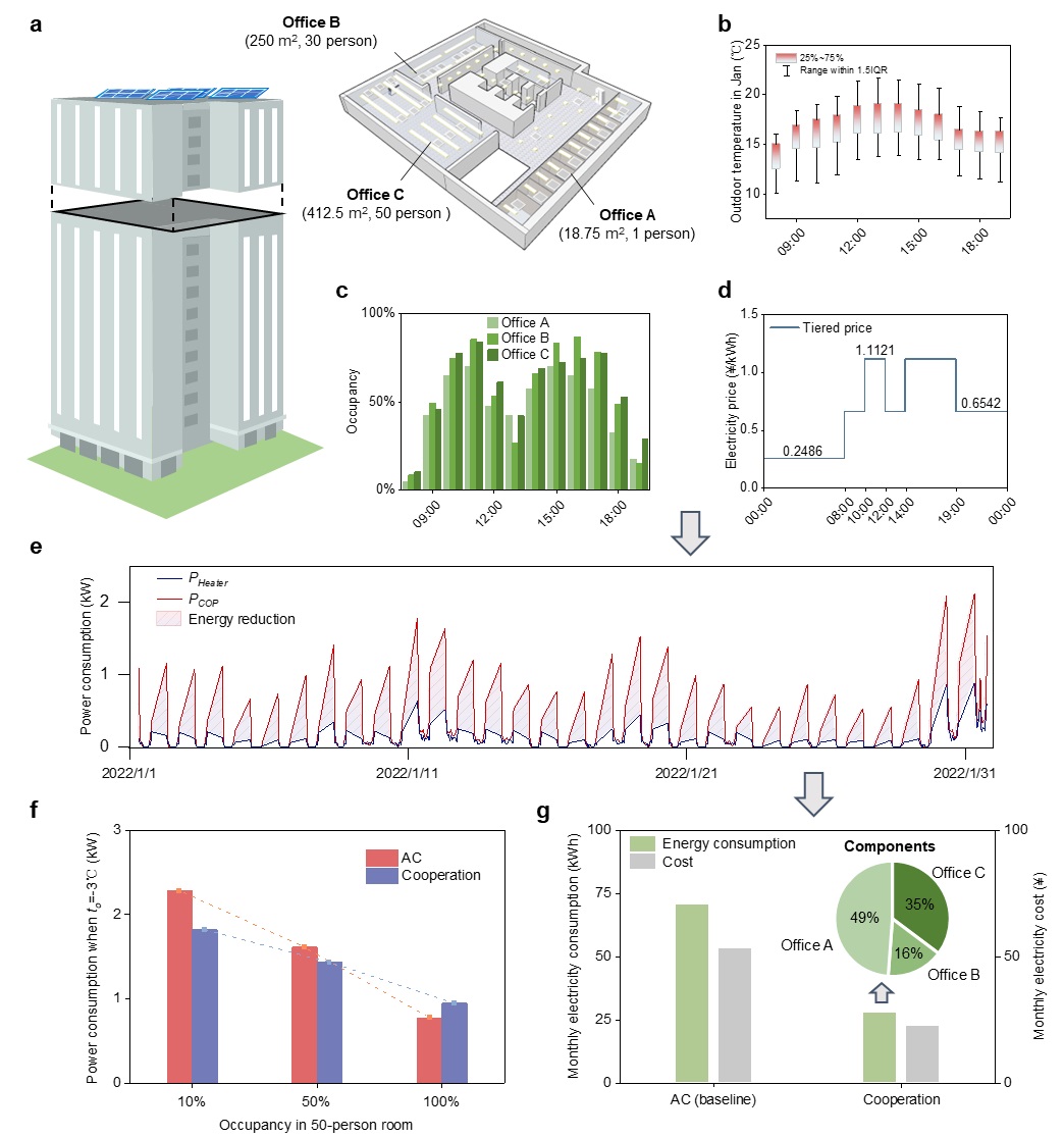 团队还进一步研究了“人体电网”在多人房间(如办公环境)中的应用,并进行了建筑级别的能耗模拟。研究显示,相比仅使用空调供暖,“人体电网”的协同策略可减少61.0%的能耗,降低57.5%的电费支出。这一发现充分说明了“人体电网”在楼宇中具有显著的节能潜力,尤其是在非全负荷办公环境(如人数不饱和的楼宇中)。