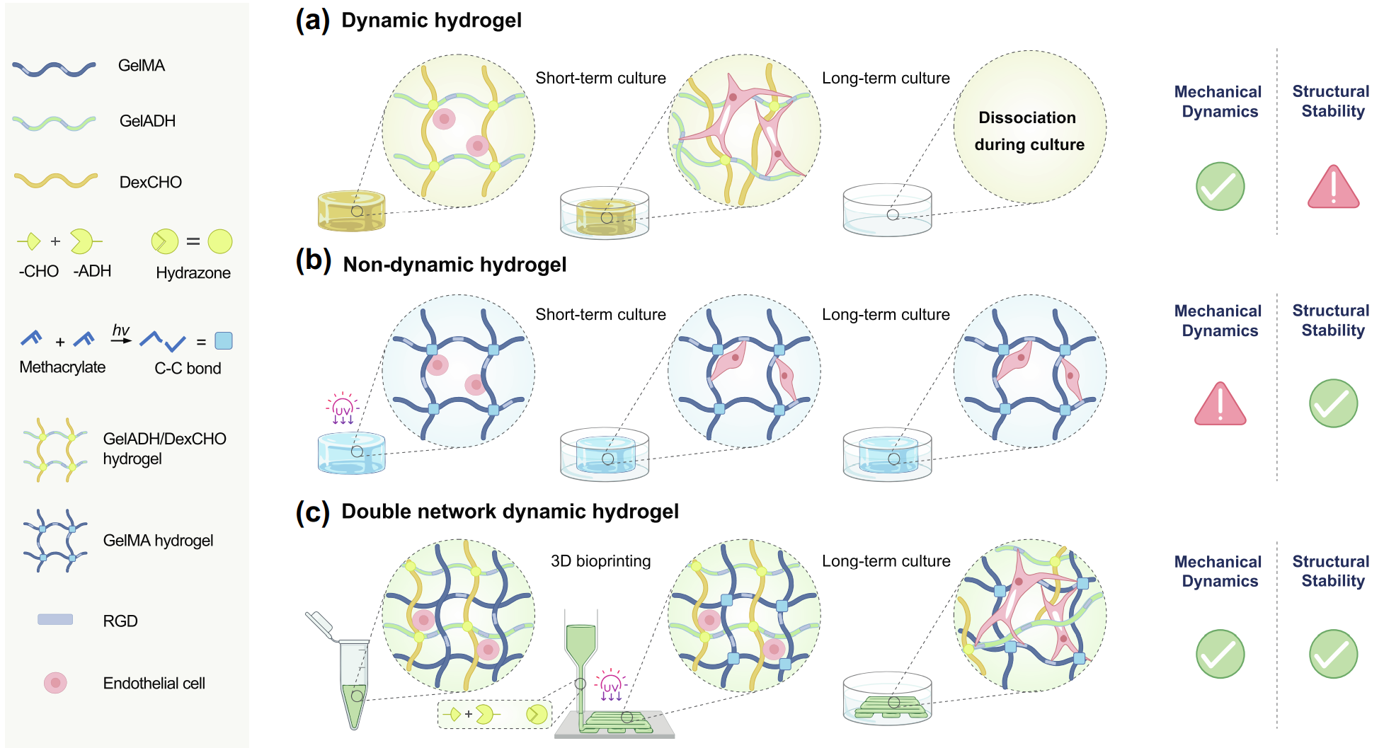 mk(中国)网3月5日电 生物组织的生长是一个动态过程,在工程化组织/器官构建中,如何构建适配的三维动态微环境是一个关键问题。已有研究表明,负载细胞的水凝胶的基质动态性有助于血管形态发生,对于构筑活性组织的“生命线”具有重要意义。然而,常见的动态水凝胶基质受限于可逆交联解离或细胞介导的降解,通常在体外培养过程中存在力学不稳定性,几天以后即出现结构坍塌降解,难以支持长期培养,阻碍了其在组织器官构建和生物制造方面的应用。