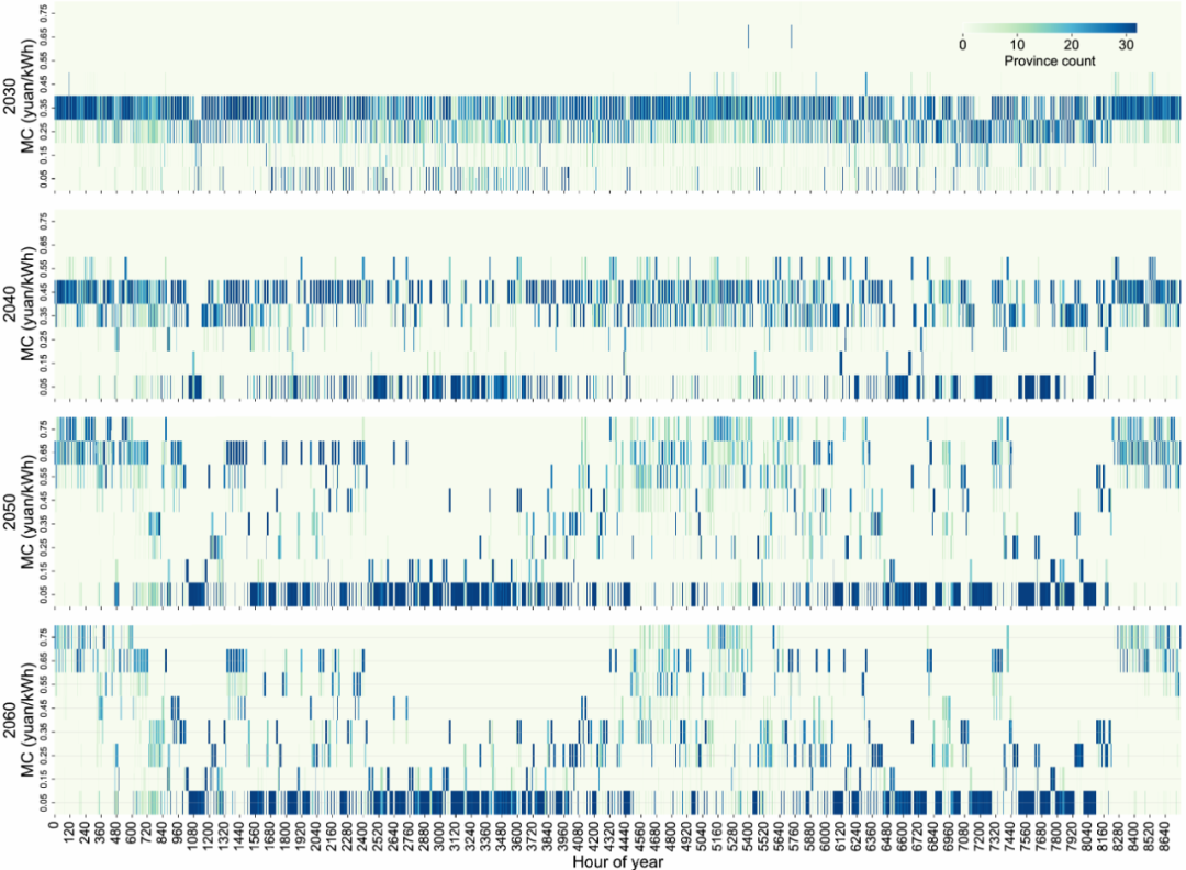 图2展示了全年逐小时各省份的电能量供给边际成本(Marginal Cost of Generation,MC,元/kWh)分布。随着大规模可再生能源的接入,电能量供给边际成本呈现更大的波动性,即极低(接近0)和极高(超过1.0元/kWh)情况出现的频率更高,这也表明电能量市场的波动性更大。